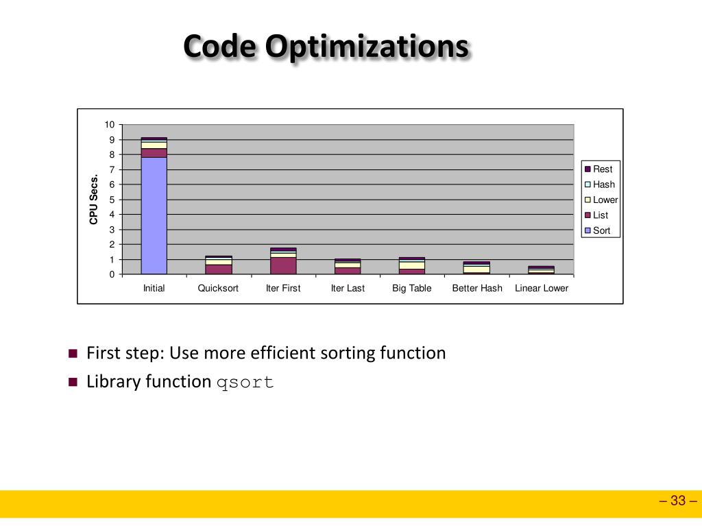 Code Optimizations • First step: Use more efficient sorting function • Library function qsort