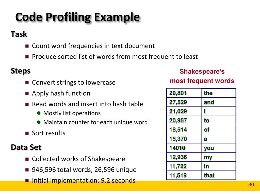 Code Profiling Example Task • Count word frequencies in text document • Produce sorted list of words from most frequent to least Steps • Convert strings to lowercase • Apply hash function • Read words and insert into hash table • Mostly list operations • Maintain counter for each unique word • Sort results Data Set • Collected works of Shakespeare • 946,596 total words, 26,596 unique • Initial implementation: 9.2 seconds • Shakespeare’s • most frequent words