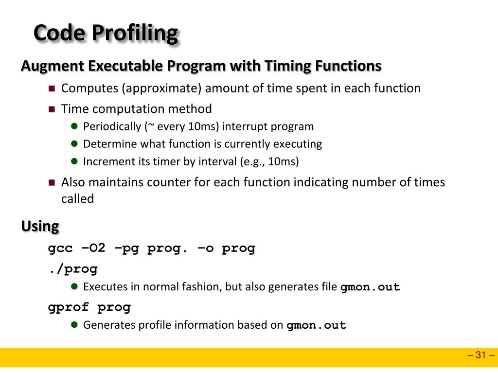 Code Profiling Augment Executable Program with Timing Functions • Computes (approximate) amount of time spent in each function • Time computation method • Periodically (~ every 10ms) interrupt program • Determine what function is currently executing • Increment its timer by interval (e.g., 10ms) • Also maintains counter for each function indicating number of times called Using gcc –O2 –pg prog. –oprog ./prog • Executes in normal fashion, but also generates file gmon.out gprofprog • Generates profile information based on gmon.out