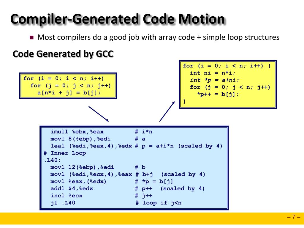Reduction in Strength • Replace costly operation with simpler one • Shift, add instead of multiply or divide 16*x --> x << 4 • Utility machine dependent • Depends on cost of multiply or divide instruction • On Pentium II or III, integer multiply only requires 4 CPU cycles • Recognize sequence of products intni = 0; for (i = 0; i < n; i++) { for (j = 0; j < n; j++) a[ni + j] = b[j]; ni += n; } for (i = 0; i < n; i++) for (j = 0; j < n; j++) a[n*i + j] = b[j];
