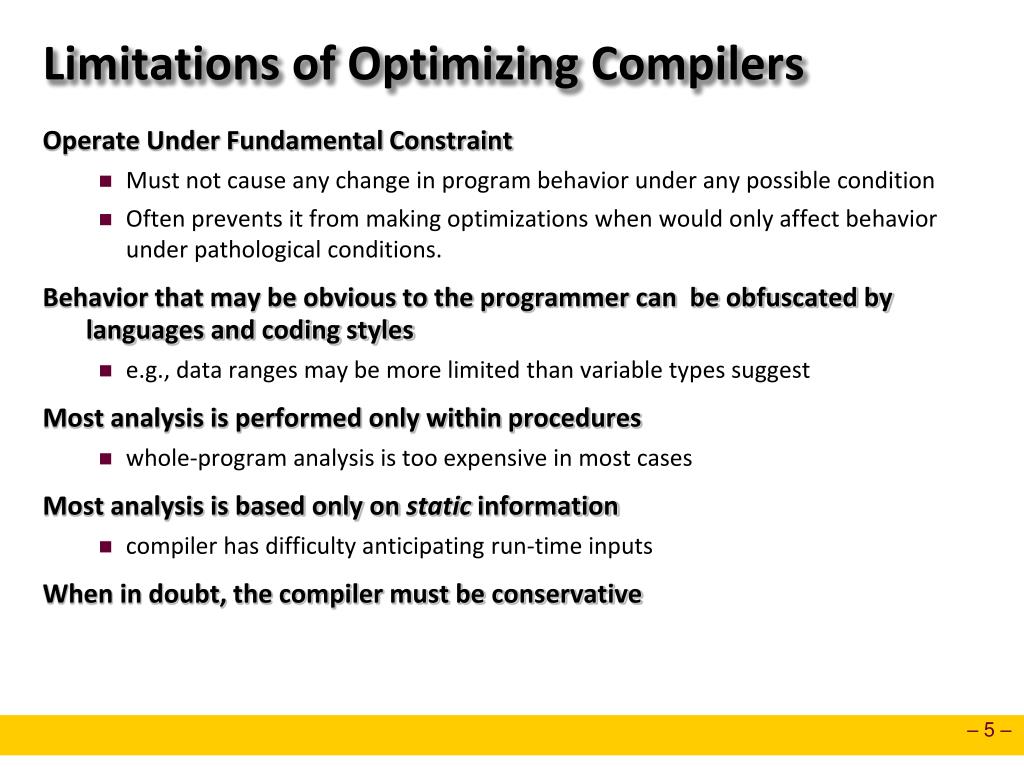 Limitations of Optimizing Compilers Operate Under Fundamental Constraint • Must not cause any change in program behavior under any possible condition • Often prevents it from making optimizations when would only affect behavior under pathological conditions. Behavior that may be obvious to the programmer can be obfuscated by languages and coding styles • e.g., data ranges may be more limited than variable types suggest Most analysis is performed only within procedures • whole-program analysis is too expensive in most cases Most analysis is based only on static information • compiler has difficulty anticipating run-time inputs When in doubt, the compiler must be conservative
