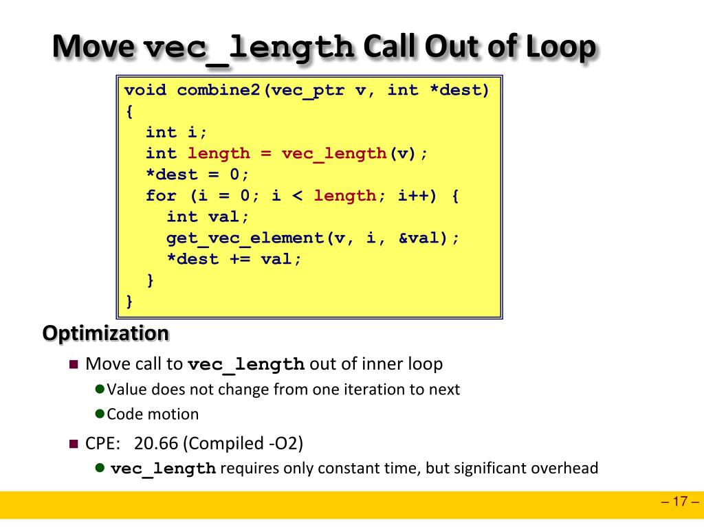 Move vec_length Call Out of Loop void combine2(vec_ptr v, int *dest) { inti; intlength = vec_length(v); *dest = 0; for (i = 0; i < length; i++) { intval; get_vec_element(v, i, &val); *dest += val; } } • Optimization • Move call to vec_length out of inner loop • Value does not change from one iteration to next • Code motion • CPE: 20.66 (Compiled -O2) • vec_lengthrequires only constant time, but significant overhead