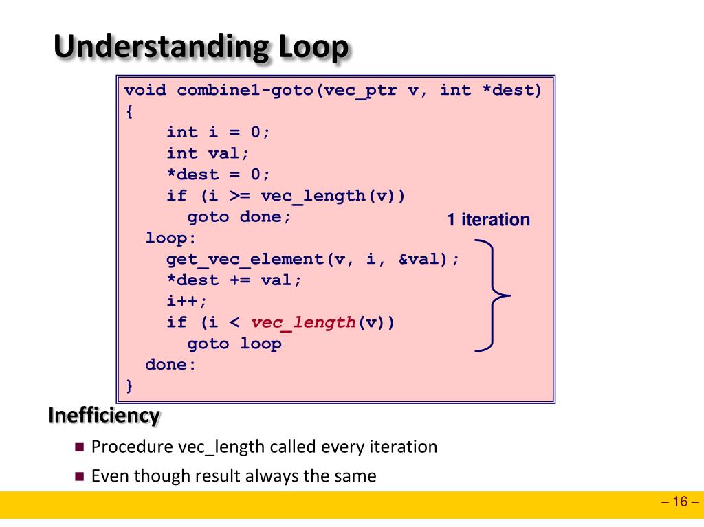 Understanding Loop void combine1-goto(vec_ptr v, int *dest) { inti = 0; intval; *dest = 0; if (i >= vec_length(v)) goto done; loop: get_vec_element(v, i, &val); *dest += val; i++; if (i < vec_length(v)) goto loop done: } • Inefficiency • Procedure vec_length called every iteration • Even though result always the same 1 iteration
