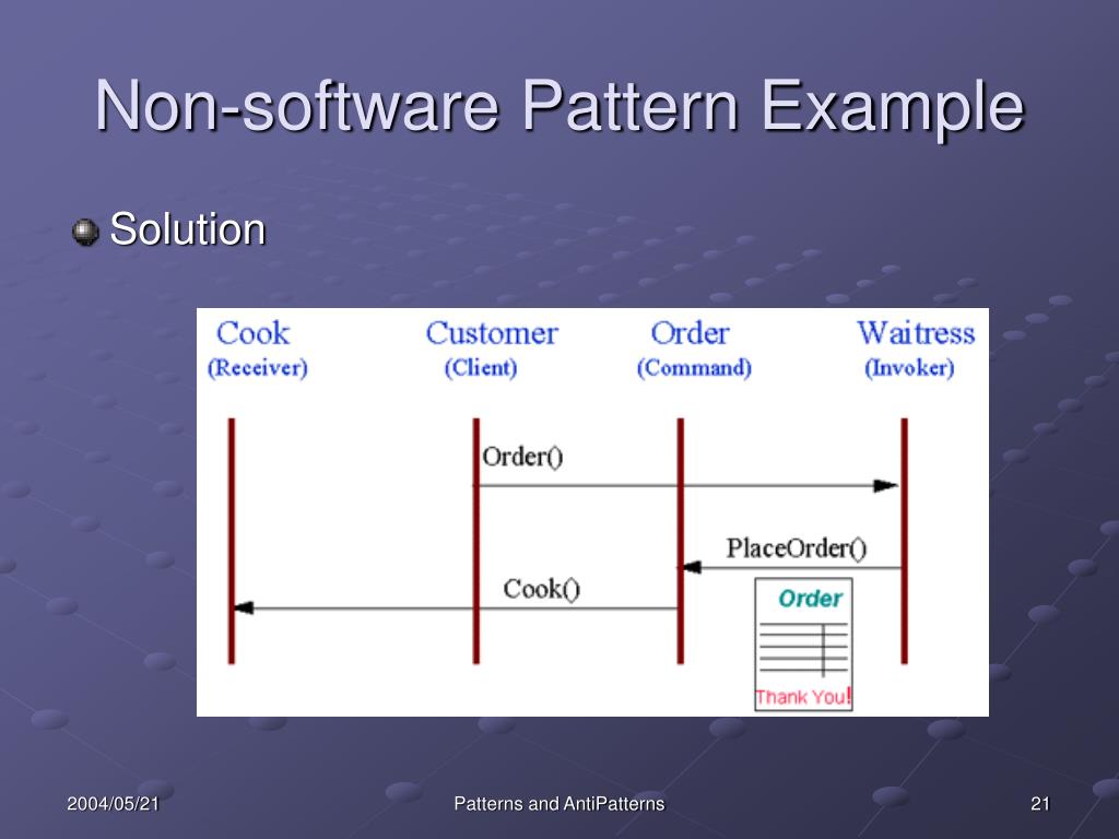 Pattern Example • Pattern Name • Command • Pattern Problem • different request • queue or log request • support undoable operations Patterns and AntiPatterns