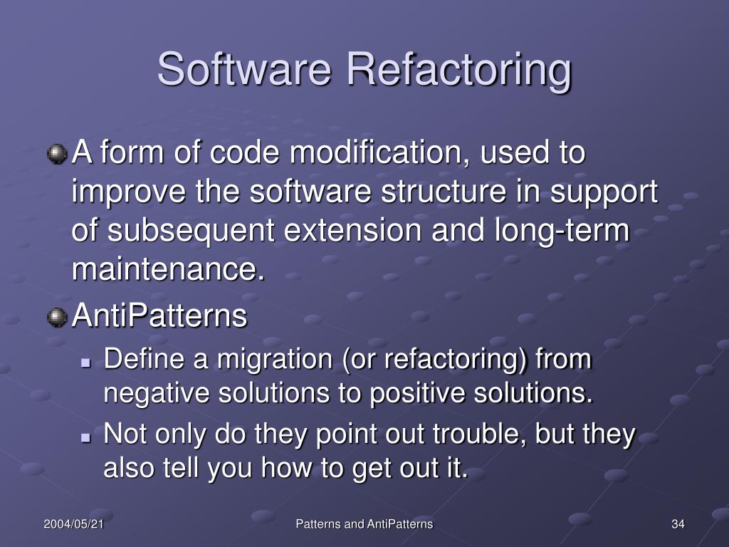 Software Refactoring • A form of code modification, used to improve the software structure in support of subsequent extension and long-term maintenance. • AntiPatterns • Define a migration (or refactoring) from negative solutions to positive solutions. • Not only do they point out trouble, but they also tell you how to get out it. Patterns and AntiPatterns