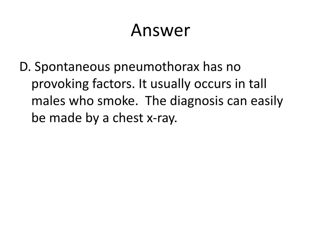 Answer D. Spontaneous pneumothorax has no provoking factors. It usually occurs in tall males who smoke. The diagnosis can easily be made by a chest x-ray.