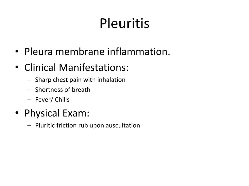 Pleuritis • Pleura membrane inflammation. • Clinical Manifestations: • Sharp chest pain with inhalation • Shortness of breath • Fever/ Chills • Physical Exam: • Pluritic friction rub upon auscultation