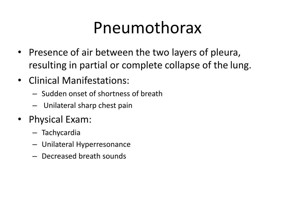 Pneumothorax • Presence of air between the two layers of pleura, resulting in partial or complete collapse of the lung. • Clinical Manifestations: • Sudden onset of shortness of breath • Unilateral sharp chest pain • Physical Exam: • Tachycardia • Unilateral Hyperresonance • Decreased breath sounds