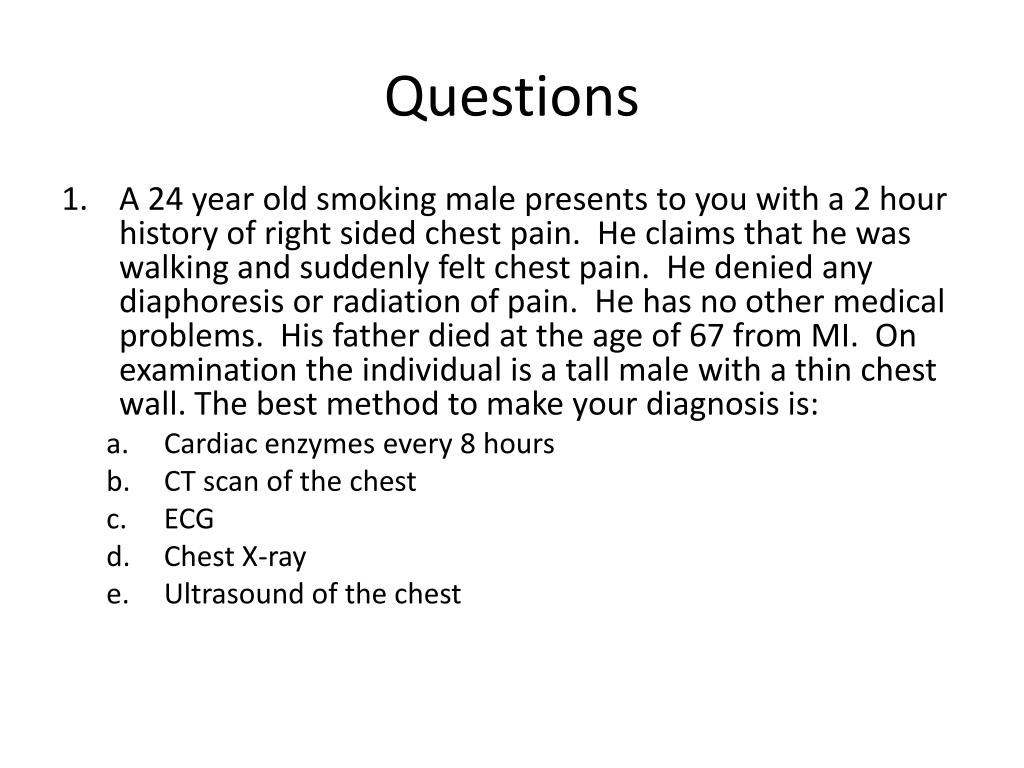 Questions • A 24 year old smoking male presents to you with a 2 hour history of right sided chest pain. He claims that he was walking and suddenly felt chest pain. He denied any diaphoresis or radiation of pain. He has no other medical problems. His father died at the age of 67 from MI. On examination the individual is a tall male with a thin chest wall. The best method to make your diagnosis is: • Cardiac enzymes every 8 hours • CT scan of the chest • ECG • Chest X-ray • Ultrasound of the chest