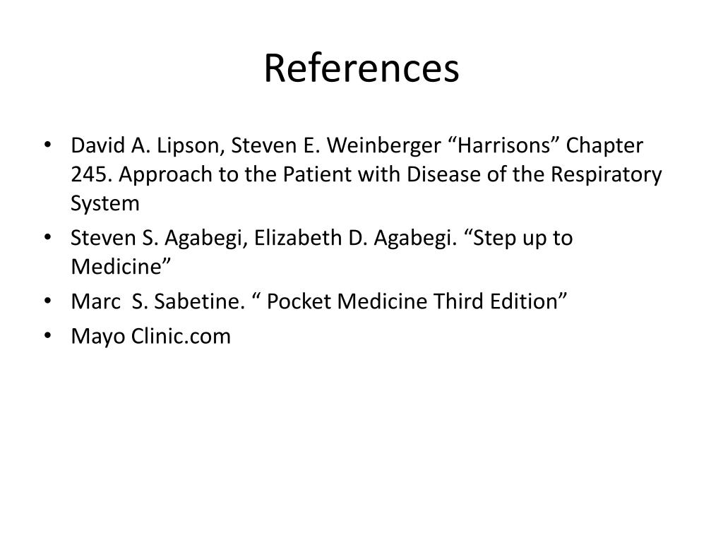 References • David A. Lipson, Steven E. Weinberger “Harrisons” Chapter 245. Approach to the Patient with Disease of the Respiratory System • Steven S. Agabegi, Elizabeth D. Agabegi. “Step up to Medicine” • Marc S. Sabetine. “ Pocket Medicine Third Edition” • Mayo Clinic.com