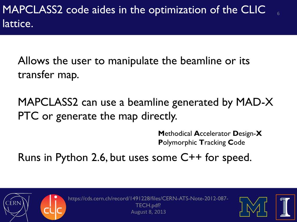 MAPCLASS2 code aides in the optimization of the CLIC lattice. Allows the user to manipulate the beamline or its transfer map. MAPCLASS2 can use a beamline generated by MAD-X PTC or generate the map directly. Runs in Python 2.6, but uses some C++ for speed. Methodical Accelerator Design-XPolymorphic Tracking Code https://cds.cern.ch/record/1491228/files/CERN-ATS-Note-2012-087-TECH.pdf? August 8, 2013