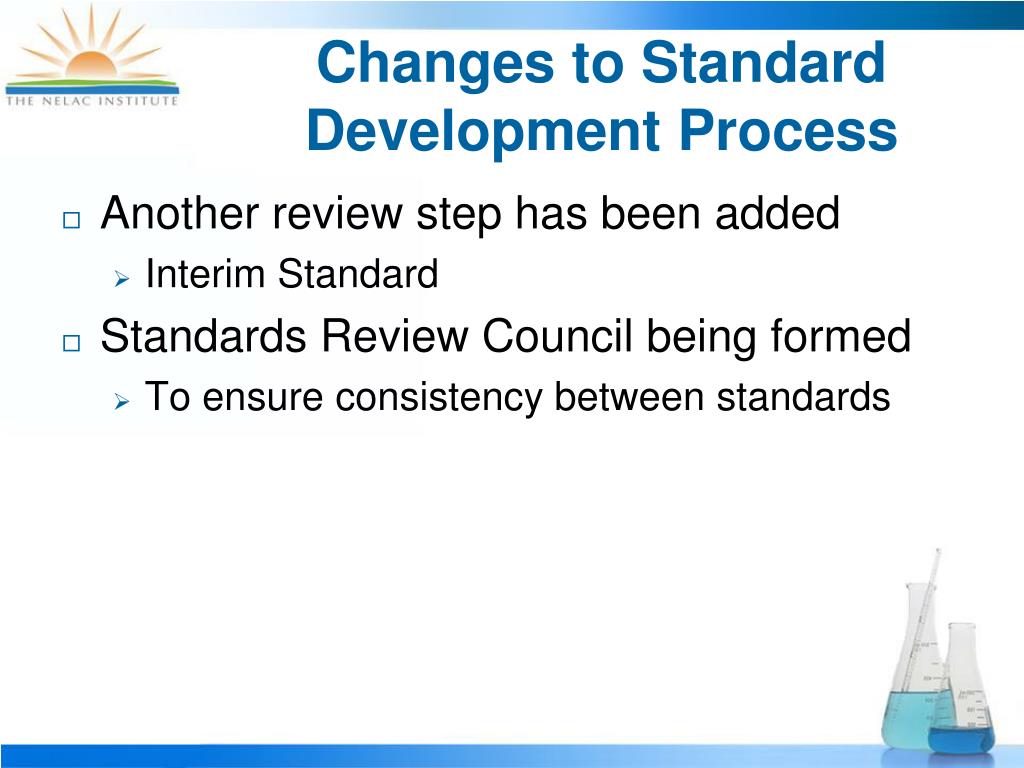 Changes to Standard Development Process • Another review step has been added • Interim Standard • Standards Review Council being formed • To ensure consistency between standards