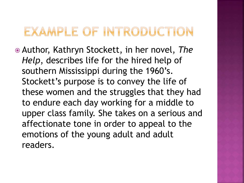 Example of introduction • Author, Kathryn Stockett, in her novel, The Help, describes life for the hired help of southern Mississippi during the 1960’s. Stockett’s purpose is to convey the life of these women and the struggles that they had to endure each day working for a middle to upper class family. She takes on a serious and affectionate tone in order to appeal to the emotions of the young adult and adult readers.