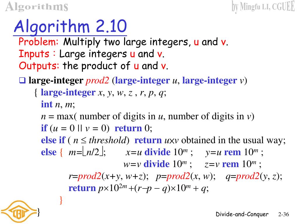 Algorithm 2.9 :Larger Integer Multiplication • Problem:Multiply two large integers, u and v. • Inputs:Largeintegers u and v. • Outputs: the product of u and v. • large-integerprod(large-integeru, large-integerv) • { large-integerx, y, w, z; • int n, m; • n = max( number of digits in u, number of digits in v) • if (u = 0 || v = 0) return 0; • else if ( n threshold) returnu×v obtained in the usual way; • else{m=n/2; • x=u divide10m ; y=urem 10m ; • w=v divide10m ; z=vrem 10m; • return prod(x, w)102m (prod(x, z)+prod(w, y))10m • prod(y, z); } • } Divide-and-Conquer