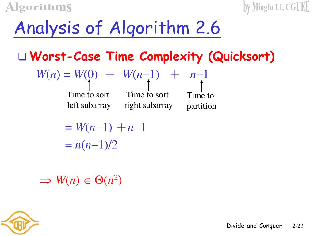 Time to sort right subarray Time to sort left subarray Time to partition Analysis of Algorithm 2.6 • Worst-Case Time Complexity (Quicksort) W(n) = W(0) + W(n1) +n1 = W(n1) +n1 = n(n1)/2 W(n) (n2) Divide-and-Conquer