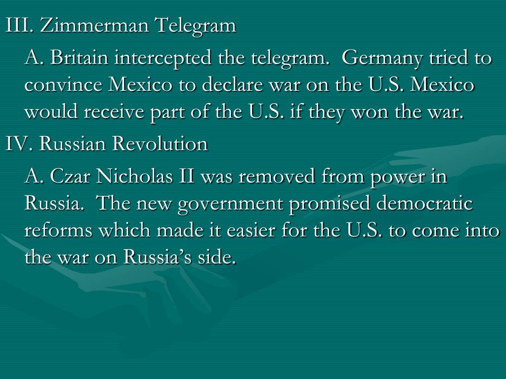 III. Zimmerman Telegram A. Britain intercepted the telegram. Germany tried to convince Mexico to declare war on the U.S. Mexico would receive part of the U.S. if they won the war. IV. Russian Revolution A. Czar Nicholas II was removed from power in Russia. The new government promised democratic reforms which made it easier for the U.S. to come into the war on Russia’s side.