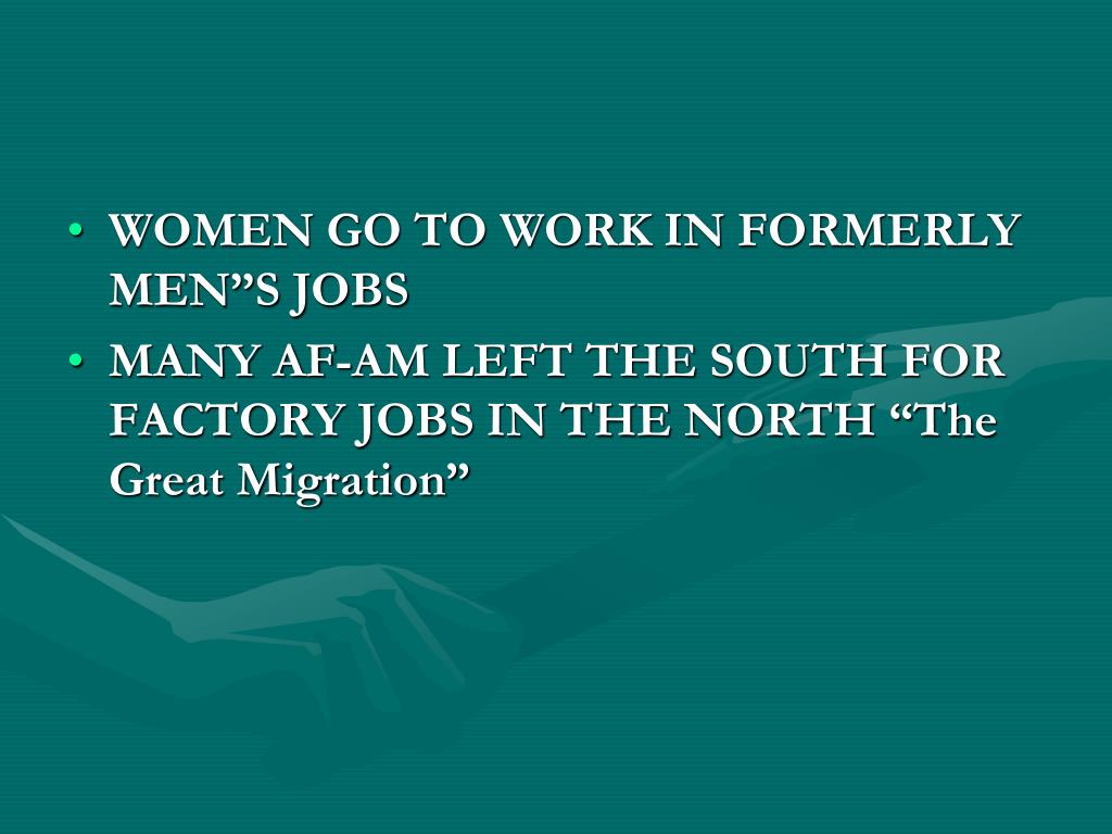 WOMEN GO TO WORK IN FORMERLY MEN”S JOBS MANY AF-AM LEFT THE SOUTH FOR FACTORY JOBS IN THE NORTH “The Great Migration”