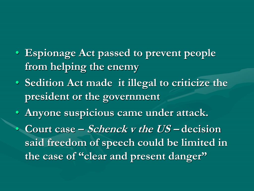 Espionage Act passed to prevent people from helping the enemy • Sedition Act made it illegal to criticize the president or the government • Anyone suspicious came under attack. • Court case – Schenck v the US – decision said freedom of speech could be limited in the case of “clear and present danger”