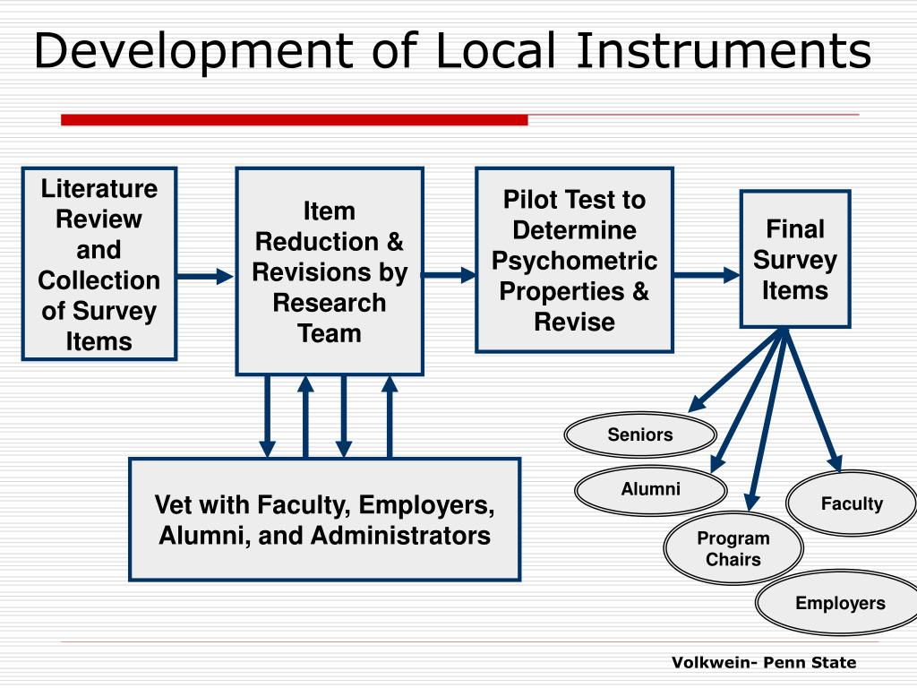 Development of Local Instruments Literature Review and Collection of Survey Items Item Reduction & Revisions by Research Team Pilot Test to Determine Psychometric Properties & Revise Final Survey Items Seniors Vet with Faculty, Employers, Alumni, and Administrators Alumni Faculty Program Chairs Employers Volkwein- Penn State