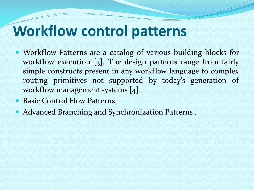 Workflow control patterns • Workflow Patterns are a catalog of various building blocks for workflow execution [3]. The design patterns range from fairly simple constructs present in any workflow language to complex routing primitives not supported by today's generation of workflow management systems [4]. • Basic Control Flow Patterns. • Advanced Branching and Synchronization Patterns .