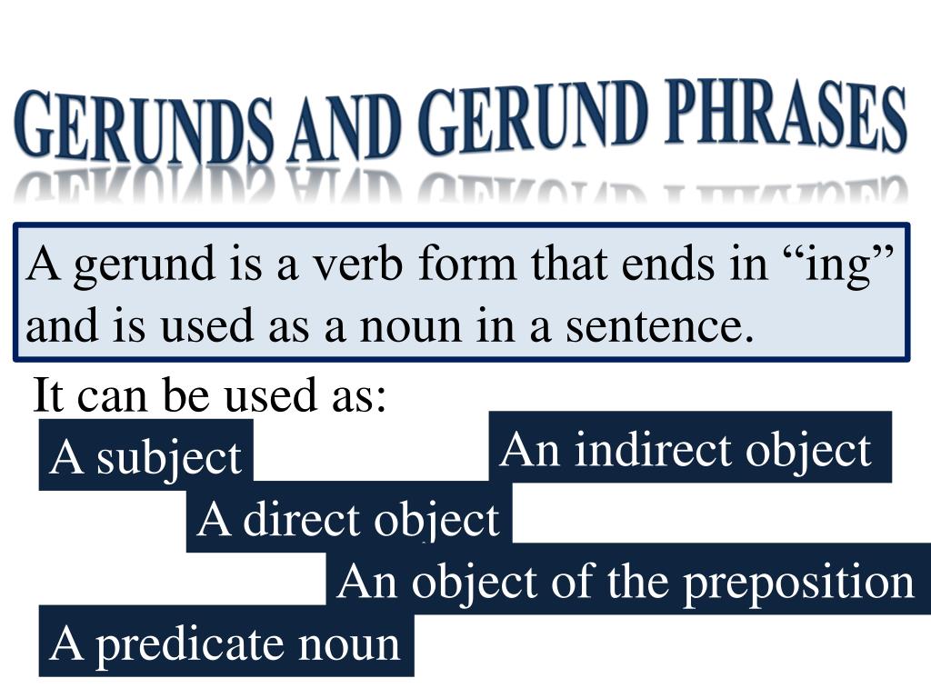 Gerunds and Gerund phrases. Gerunds and Gerund phrases. A gerund is a verb form that ends in “ ing ” and is used as a noun in a sentence. It can be used as:. An indirect object. A subject. A direct object. An object of the preposition. A predicate noun. Subject :