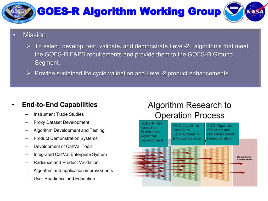 GOES-R Algorithm Working Group. Mission: To select, develop, test, validate, and demonstrate Level-2+ algorithms that meet the GOES-R F&PS requirements and provide them to the GOES-R Ground Segment. Provide sustained life cycle validation and Level-2 product enhancement s.