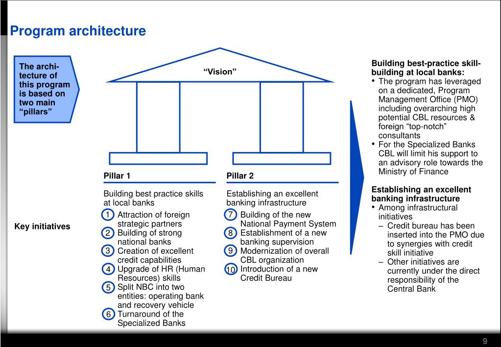 “Vision” • 1 • 7 • 2 • 8 • 3 • 9 • 10 • 5 • 6 • 4 Program architecture • Building best-practice skill-building at local banks: • The program has leveraged on a dedicated, Program Management Office (PMO) including overarching high potential CBL resources & foreign “top-notch” consultants • For the Specialized Banks CBL will limit his support to an advisory role towards the Ministry of Finance • Establishing an excellent banking infrastructure • Among infrastructural initiatives • Credit bureau has been inserted into the PMO due to synergies with credit skill initiative • Other initiatives are currently under the direct responsibility of the Central Bank • The archi-tecture of this program is based on two main “pillars” • Pillar 1 • Pillar 2 • Building best practice skills at local banks • Establishing an excellent banking infrastructure • Attraction of foreign strategic partners • Building of strong national banks • Creation of excellent credit capabilities • Upgrade of HR (Human Resources) skills • Split NBC into two entities: operating bank and recovery vehicle • Turnaround of the Specialized Banks • Building of the new National Payment System • Establishment of a new banking supervision • Modernization of overall CBL organization • Introduction of a new Credit Bureau • Key initiatives