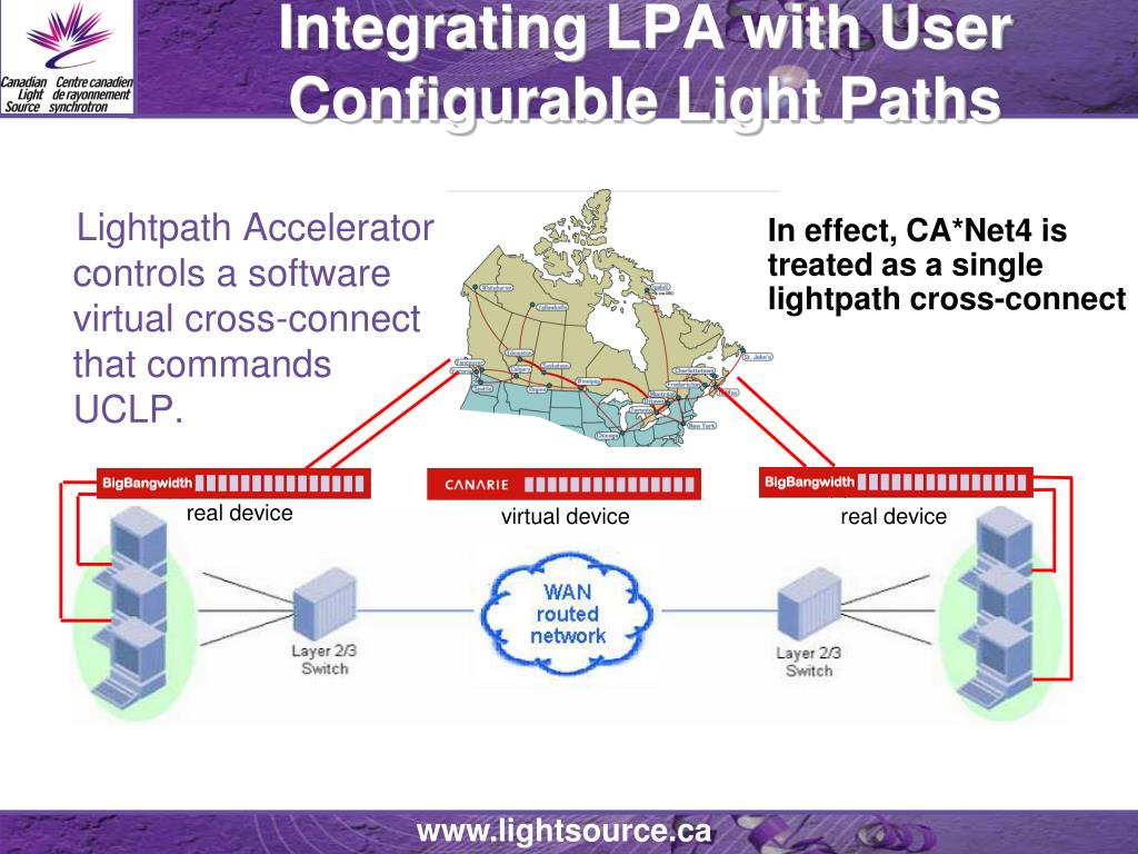 Integrating LPA with User Configurable Light Paths Lightpath Accelerator controls a software virtual cross-connect that commands UCLP. In effect, CA*Net4 is treated as a single lightpath cross-connect real device real device virtual device