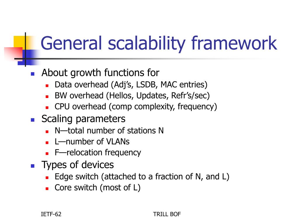 General scalability framework • About growth functions for • Data overhead (Adj’s, LSDB, MAC entries) • BW overhead (Hellos, Updates, Refr’s/sec) • CPU overhead (comp complexity, frequency) • Scaling parameters • N—total number of stations N • L—number of VLANs • F—relocation frequency • Types of devices • Edge switch (attached to a fraction of N, and L) • Core switch (most of L) TRILL BOF