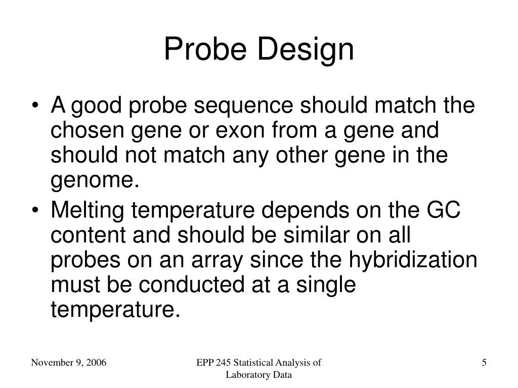 Probe Design • A good probe sequence should match the chosen gene or exon from a gene and should not match any other gene in the genome. • Melting temperature depends on the GC content and should be similar on all probes on an array since the hybridization must be conducted at a single temperature. EPP 245 Statistical Analysis of Laboratory Data
