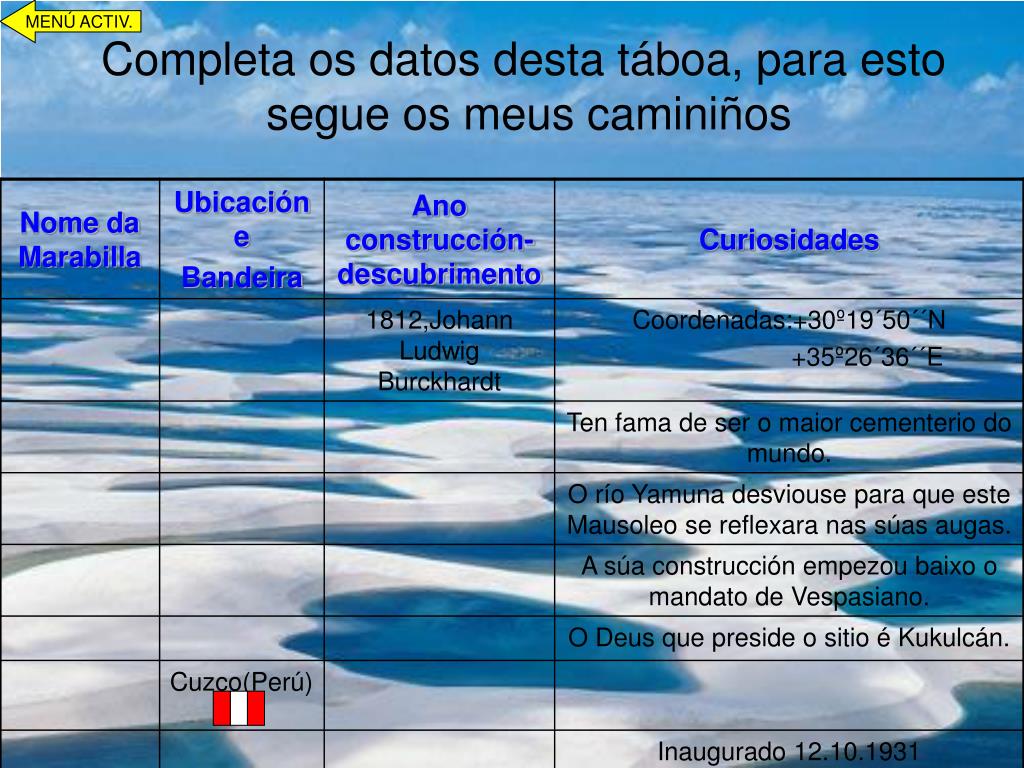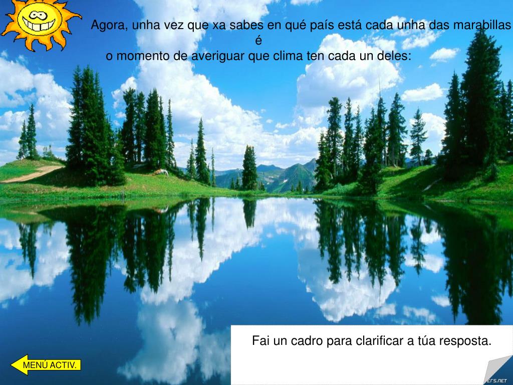 Agora, unha vez que xa sabes en qué país está cada unha das marabillas é o momento de averiguar que clima ten cada un deles: Fai un cadro para clarificar a túa resposta. MENÚ ACTIV.