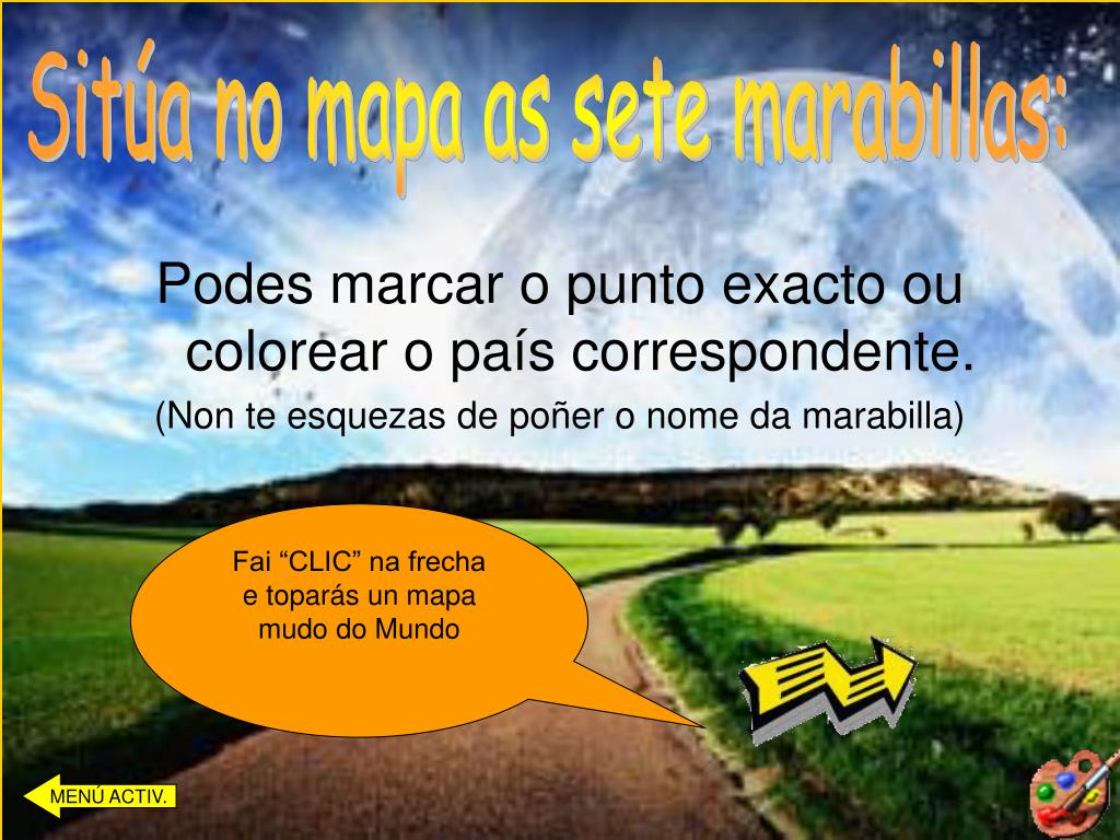 Sitúa no mapa as sete marabillas: Podes marcar o punto exacto ou colorear o país correspondente. (Non te esquezas de poñer o nome da marabilla) Fai “CLIC” na frecha e toparás un mapa mudo do Mundo MENÚ ACTIV.
