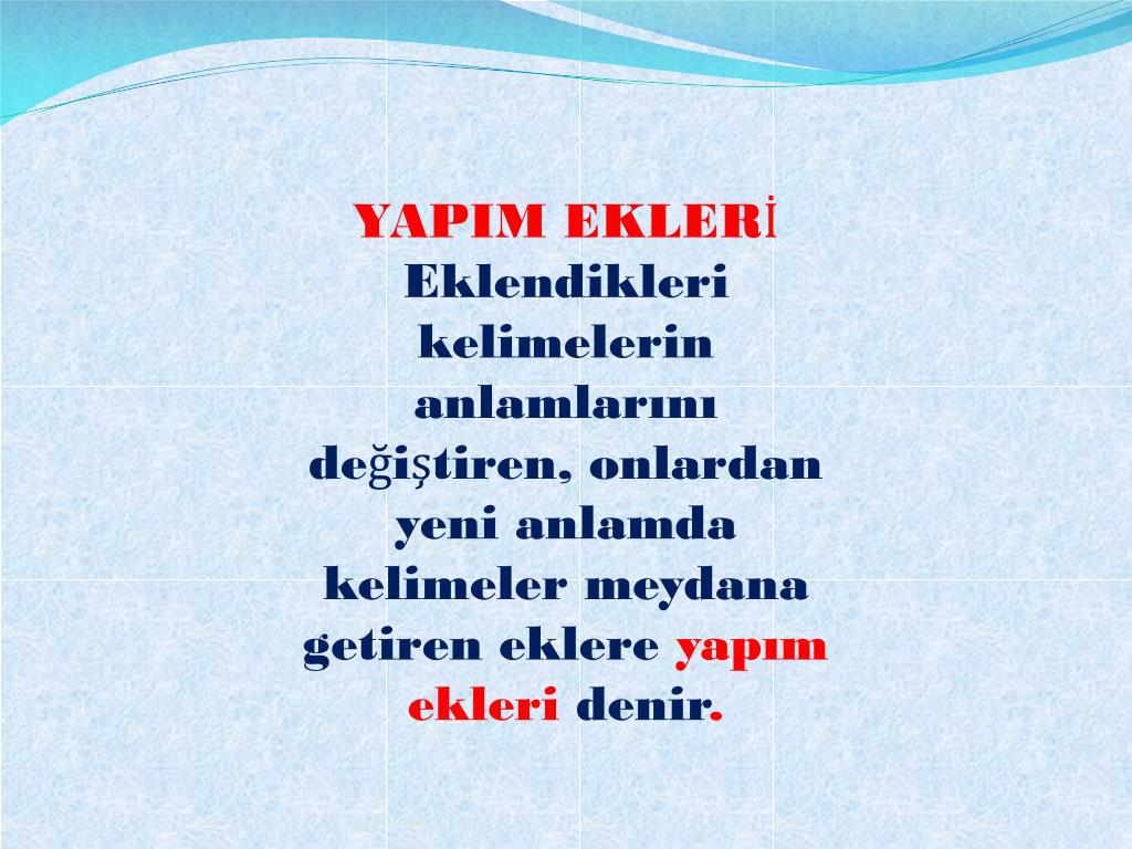 YAPIM EKLERİ Eklendikleri kelimelerin anlamlarını değiştiren, onlardan yeni anlamda kelimeler meydana getiren eklere yapım ekleri denir. …Egitimhane.com…
