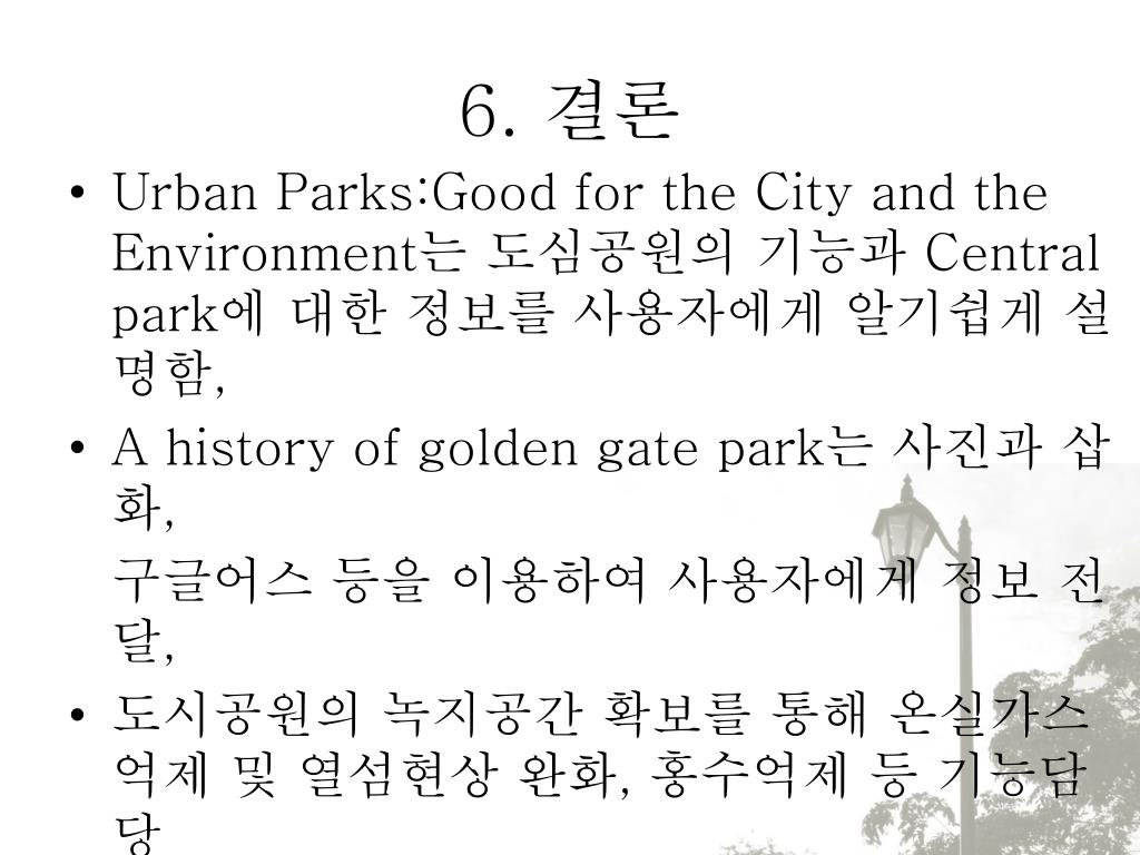 6. 결론 • Urban Parks:Good for the City and the Environment는 도심공원의 기능과 Central park에 대한 정보를 사용자에게 알기쉽게 설명함, • A history of golden gate park는 사진과 삽화, 구글어스 등을 이용하여 사용자에게 정보 전달, • 도시공원의 녹지공간 확보를 통해 온실가스 억제 및 열섬현상 완화, 홍수억제 등 기능담당 • GIS와 연계, 도시광역공간 차원에서의 도심녹지공간 확보 및 관리를 통하여 도시계획의 효율성 제고 및 지구온난화로 인한 이상기후에 효과적으로 대비