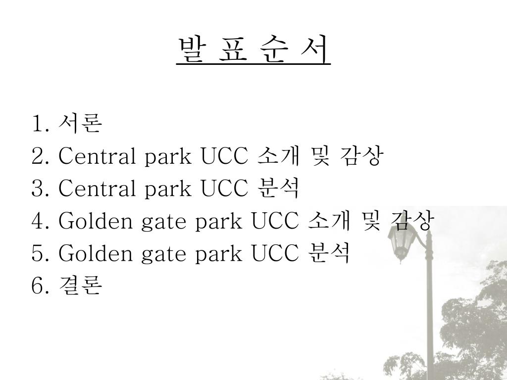 발 표 순 서 1. 서론 2. Central park UCC 소개 및 감상 3. Central park UCC 분석 4. Golden gate park UCC 소개 및 감상 5. Golden gate park UCC 분석 6. 결론