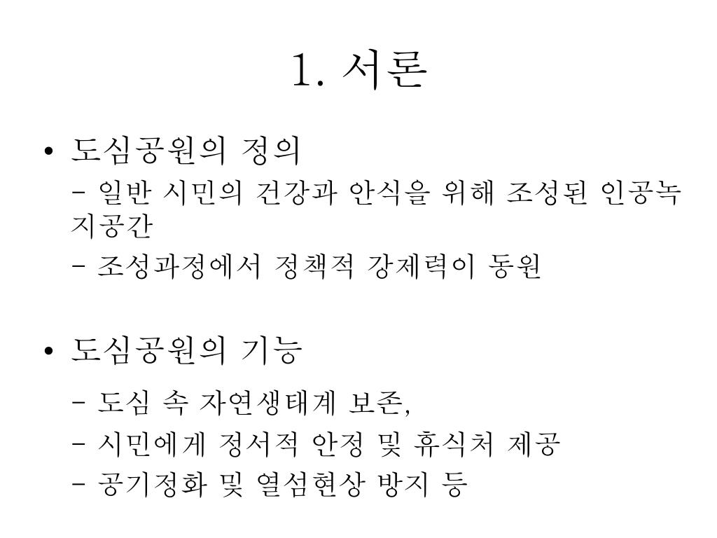 1. 서론 • 도심공원의 정의 - 일반 시민의 건강과 안식을 위해 조성된 인공녹지공간 - 조성과정에서 정책적 강제력이 동원 • 도심공원의 기능 - 도심 속 자연생태계 보존, - 시민에게 정서적 안정 및 휴식처 제공 - 공기정화 및 열섬현상 방지 등