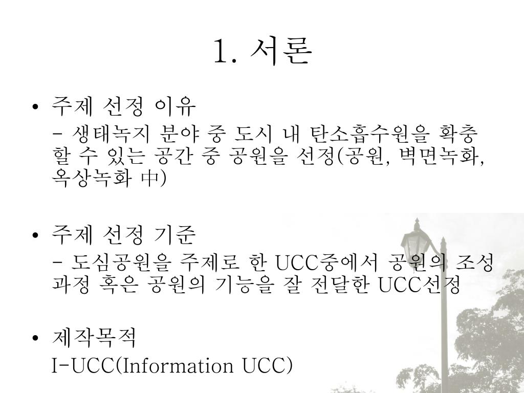 1. 서론 • 주제 선정 이유 - 생태녹지분야 중 도시 내 탄소흡수원을확충할 수 있는 공간 중 공원을 선정(공원, 벽면녹화, 옥상녹화 中) • 주제 선정 기준 - 도심공원을 주제로 한 UCC중에서 공원의 조성과정 혹은 공원의 기능을 잘 전달한 UCC선정 • 제작목적 I-UCC(Information UCC)