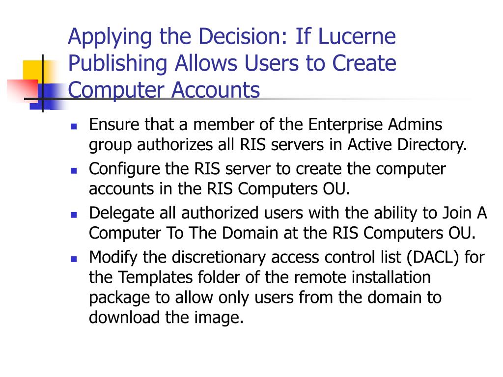 Applying the Decision: If Lucerne Publishing Allows Users to Create Computer Accounts • Ensure that a member of the Enterprise Admins group authorizes all RIS servers in Active Directory. • Configure the RIS server to create the computer accounts in the RIS Computers OU. • Delegate all authorized users with the ability to Join A Computer To The Domain at the RIS Computers OU. • Modify the discretionary access control list (DACL) for the Templates folder of the remote installation package to allow only users from the domain to download the image.