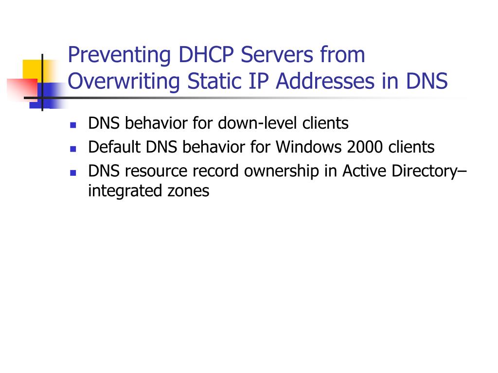 Preventing DHCP Servers from Overwriting Static IP Addresses in DNS • DNS behavior for down-level clients • Default DNS behavior for Windows 2000 clients • DNS resource record ownership in Active Directory–integrated zones