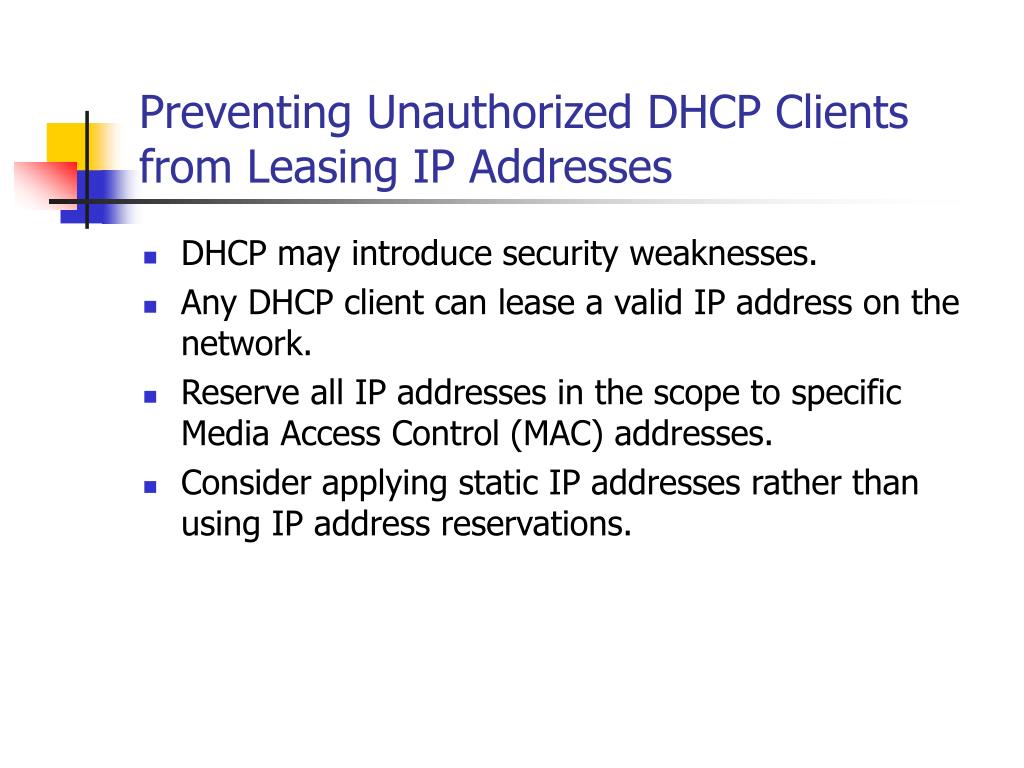 Preventing Unauthorized DHCP Clients from Leasing IP Addresses • DHCP may introduce security weaknesses. • Any DHCP client can lease a valid IP address on the network. • Reserve all IP addresses in the scope to specific Media Access Control (MAC) addresses. • Consider applying static IP addresses rather than using IP address reservations.