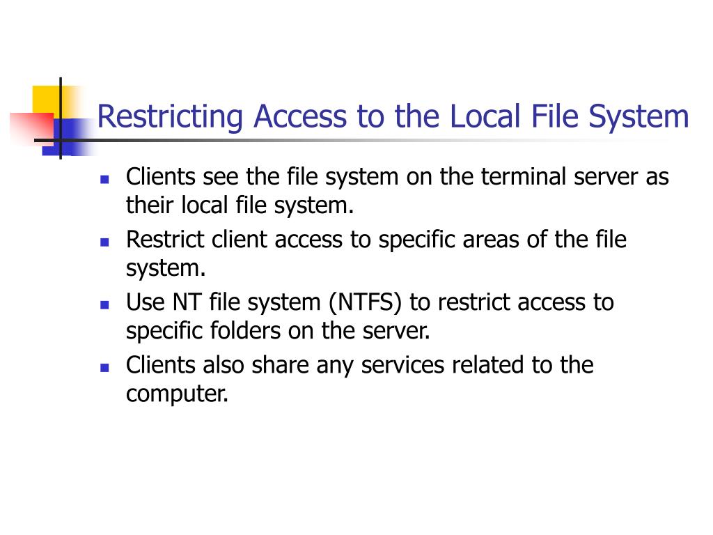 Restricting Access to the Local File System • Clients see the file system on the terminal server as their local file system. • Restrict client access to specific areas of the file system. • Use NT file system (NTFS) to restrict access to specific folders on the server. • Clients also share any services related to the computer.