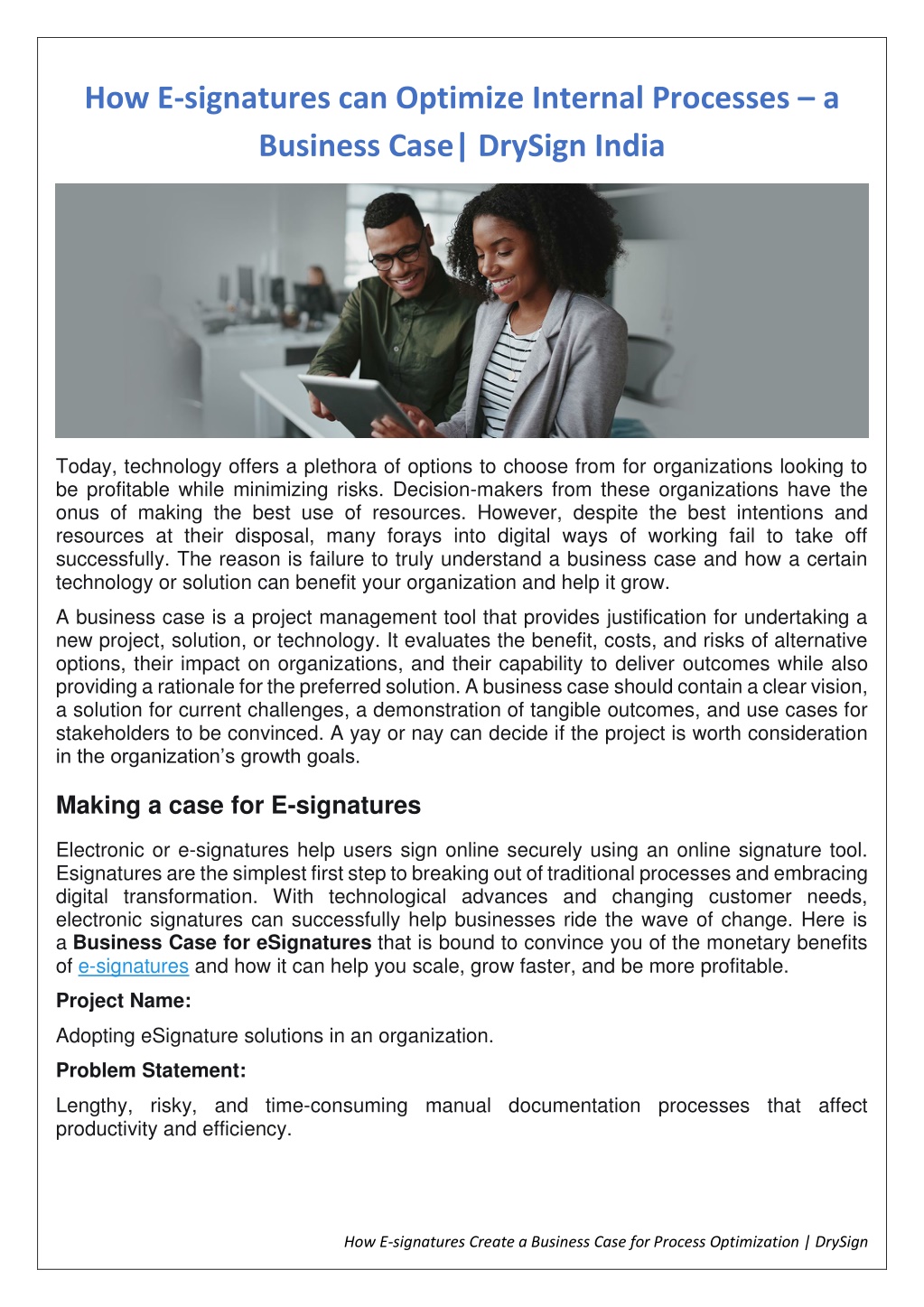 How E-signatures can Optimize Internal Processes – a Business Case| DrySign India Today, technology offers a plethora of options to choose from for organizations looking to be profitable while minimizing risks. Decision-makers from these organizations have the onus of making the best use of resources. However, despite the best intentions and resources at their disposal, many forays into digital ways of working fail to take off successfully. The reason is failure to truly understand a business case and how a certain technology or solution can benefit your organization and help it grow. A business case is a project management tool that provides justification for undertaking a new project, solution, or technology. It evaluates the benefit, costs, and risks of alternative options, their impact on organizations, and their capability to deliver outcomes while also providing a rationale for the preferred solution. A business case should contain a clear vision, a solution for current challenges, a demonstration of tangible outcomes, and use cases for stakeholders to be convinced. A yay or nay can decide if the project is worth consideration in the organization’s growth goals. Making a case for E-signatures Electronic or e-signatures help users sign online securely using an online signature tool. Esignatures are the simplest first step to breaking out of traditional processes and embracing digital transformation. With technological advances and changing customer needs, electronic signatures can successfully help businesses ride the wave of change. Here is a Business Case for eSignatures that is bound to convince you of the monetary benefits of e-signatures and how it can help you scale, grow faster, and be more profitable. Project Name: Adopting eSignature solutions in an organization. Problem Statement: Lengthy, risky, and time-consuming manual documentation processes that affect productivity and efficiency. How E-signatures Create a Business Case for Process Optimization | DrySign