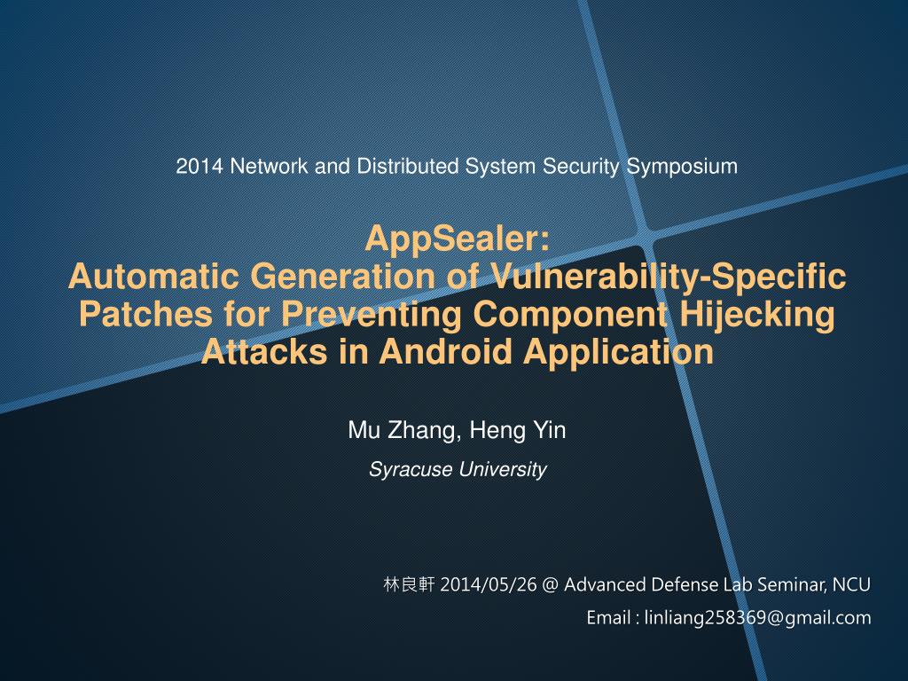 2014 Network and Distributed System Security SymposiumAppSealer: Automatic Generation of Vulnerability-Specific Patches for Preventing Component Hijecking Attacks in Android ApplicationMu Zhang, Heng Yin Syracuse University 林良軒 2014/05/26 @ Advanced Defense Lab Seminar, NCU Email : linliang258369@gmail.com