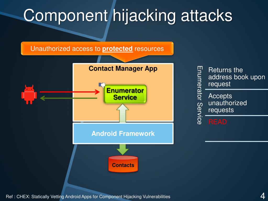 Unauthorized access to protected resources Contact Manager App • Enumerator • Service Component hijacking attacks Android Framework Contacts Ref : CHEX: Statically Vetting Android Apps for Component Hijacking Vulnerabilities