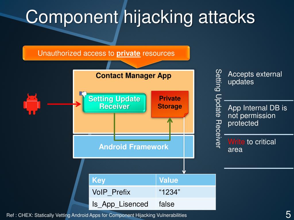 Component Hijacking Attack : A class of attacks that seek to gain unauthorized access (read/write or combined) to protected or private resources through exported componentsin vulnerable apps. Ref : CHEX: Statically Vetting Android Apps for Component Hijacking Vulnerabilities (CCS 2012) Introduction