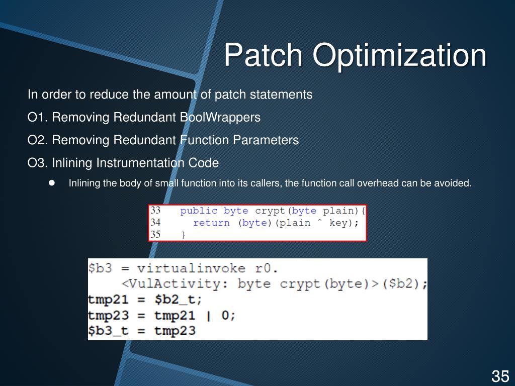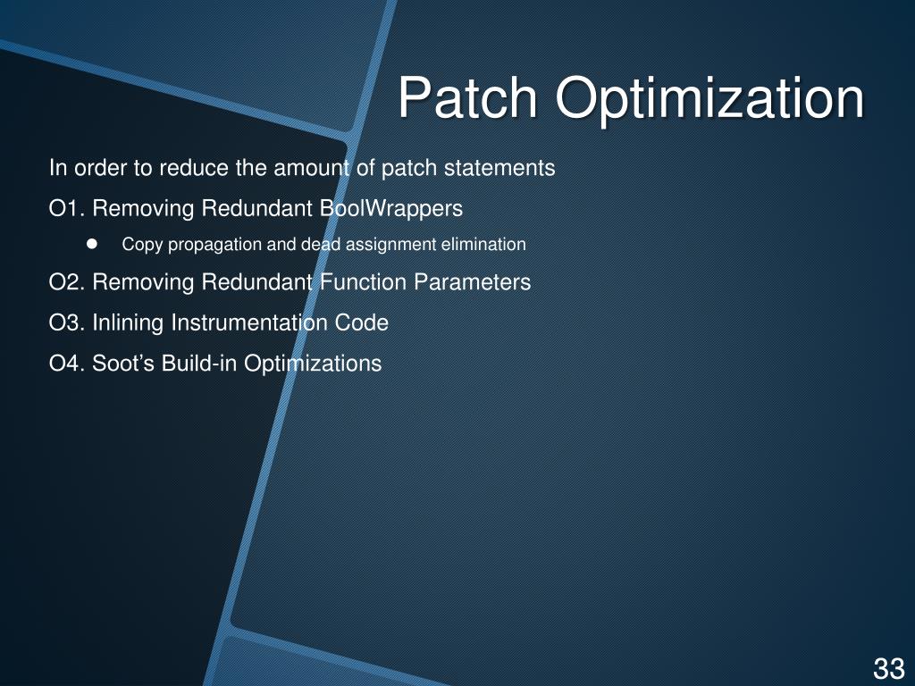 In order to reduce the amount of patch statements O1. Removing Redundant BoolWrappers O2. Removing Redundant Function Parameters O3. Inlining Instrumentation Code O4. Soot’s Build-in Optimizations Patch Optimization