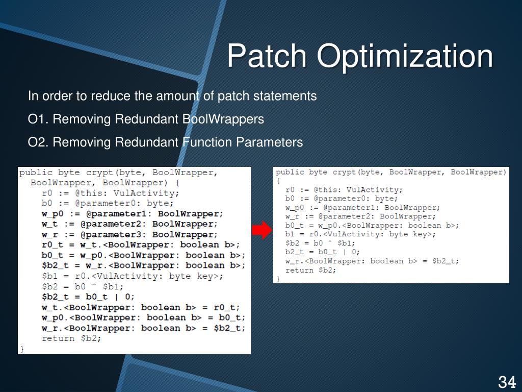 In order to reduce the amount of patch statements O1. Removing Redundant BoolWrappers O2. Removing Redundant Function Parameters Patch Optimization