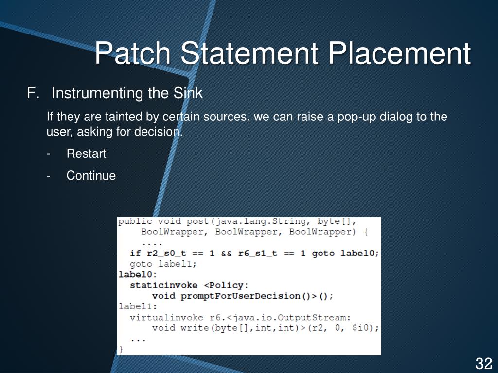 Instrumenting the Sink If they are tainted by certain sources, we can raise a pop-up dialog to the user, asking for decision. • Restart • Continue Patch Statement Placement