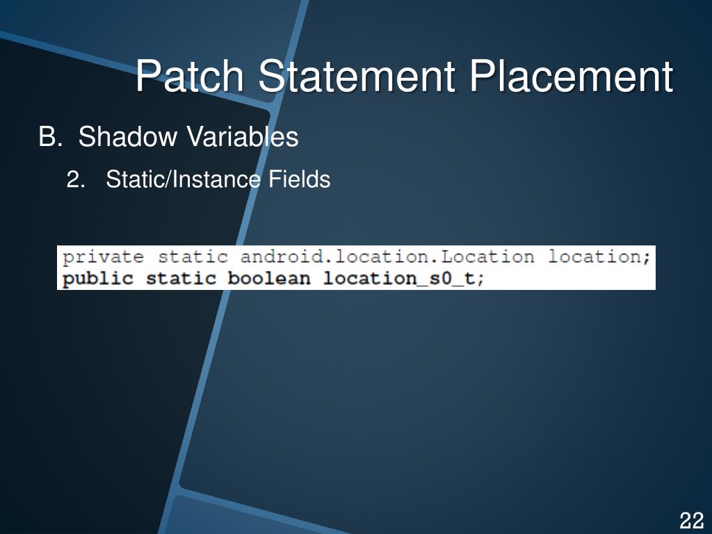 Shadow Variables 2. Static/Instance Fields Patch Statement Placement