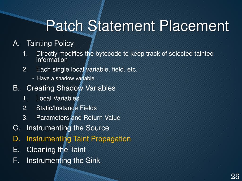 Tainting Policy • Directly modifies the bytecode to keep track of selected tainted information • Each single local variable, field, etc. - Have a shadow variable • Creating Shadow Variables • Local Variables • Static/Instance Fields • Parameters and Return Value • Instrumenting the Source • Instrumenting Taint Propagation • Cleaning the Taint • Instrumenting the Sink Patch Statement Placement